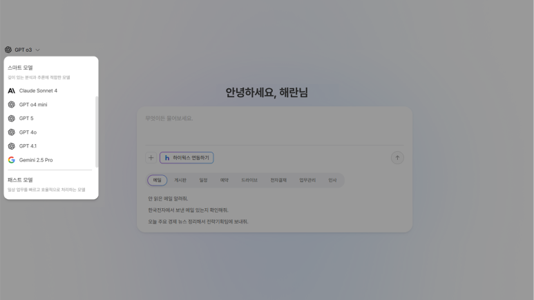 하이웍스 AI채팅은 상황에 맞춰 ChatGPT·Gemini·Claude를 모두 선택할 수 있으므로 업무 특성에 따라 자유롭게 전환하며 활용하시면 됩니다.