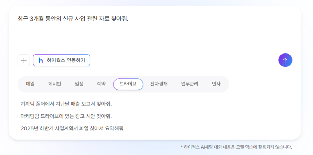 자료 확인“최근 3개월 동안의 신규 사업 관련 자료 찾아줘.”드라이브에 저장된 관련 문서를 빠르게 확인할 수 있습니다.