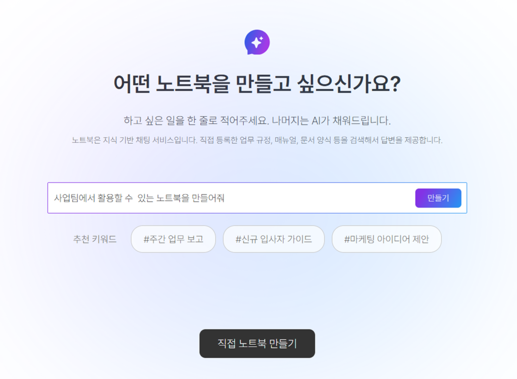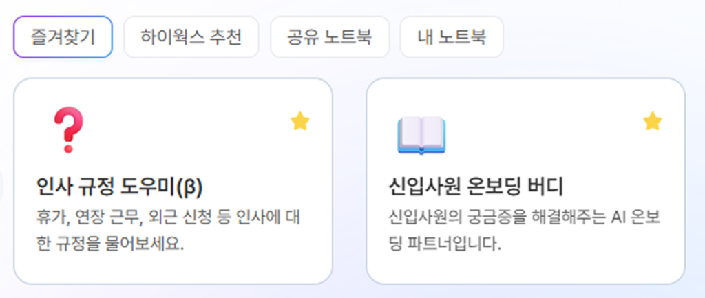 노트북에 자주 사용하는 기준과 안내 내용을 미리 정리해두면, AI채팅은 해당 기준을 이해한 상태로 답변을 제공합니다. 특히 임직원으로부터 반복적으로 들어오는 휴가, 근무, 제도 관련 문의 내용을 노트북으로 정리해 전사에 공유해두면, 인사팀이 일일이 대응하던 문의 응대 업무를 크게 줄일 수 있죠.