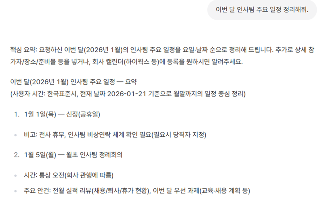 일정 확인“이번 달 인사팀 주요 일정 정리해줘.”채용 일정, 평가 기간, 교육 일정 등을 한눈에 확인할 수 있습니다.