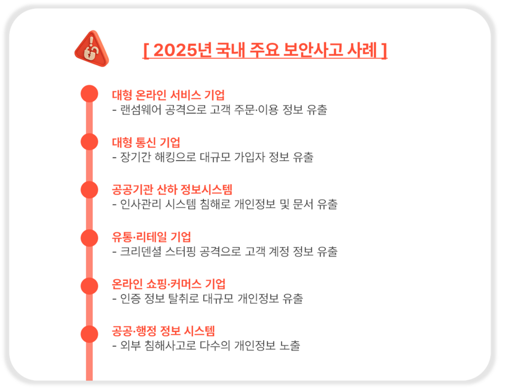 최근 사례만 보아도 현실은 심각합니다. 대규모 통신·유통·플랫폼 기업을 중심으로 개인정보 유출, 랜섬웨어 공격, 계정 탈취 등 다양한 침해사고가 발생해 왔으며, 일부 사고는 장기간 인지되지 못한 채 피해가 확대되기도 했습니다. 이처럼 복합적인 보안사고가 기업을 위협하는 현실은 ‘우리 기업은 안전하다’라는 믿음이 얼마나 위험한지 보여줍니다.